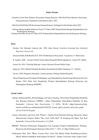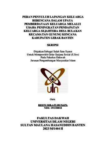 Hunapa, Restu Milati (2023) Peran Penyuluh Lapangan Keluarga Berencana (PLKB) dalam Upaya Pemberdayaan Keluarga di Desa Bulakan Kecamatan Gunung Kencana Kabupaten Lebak Banten. Diploma atau S1 thesis, UIN Sultan Maulana Hasanuddin Banten.