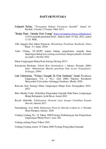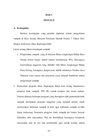 Pengelolaan Sampah Di Kota Serang merupakan tanggung jawab Masyarakat, pemerintah dan Dinas Lingkungan Hidup Kota serang. Penelitian ini dilakukan untuk mengetahui pengelolaan sampah yang di lakukan dinas lingkungan hidup kota serang dan kesesuaian program dari dinas lingkungan hidup kota serang dalam menangani sampah di kota serang. Peneliti akan menggambarkan pengelolaan sampah dan kesesuaian program menurut Peraturan Daerah Nomor 7 Tahun 2021. Namun pada penelitian ini, peneliti memfokuskan pada pengelolaan dan kesesuaian program agar sesuai dengan kebutuhan penelitian. Metode yang digunakan adalah metode penelitian kualitatif deskriptif. Hasil penelitian ini menunjukkan bahwa penanganan pengelolaan sampah di Kota Serang masih berjalan kurang maksimal. Program yang sudah direncanakan masih terdapat beberapa hambatan, serta proses pengawasan terhadap sampah liar masih belum berjalan dengan baik dan ketersediaan anggaran masih dirasa belum mencukupi untuk penanganan permasalahan sampah di Kota Serang. Sehingga membuat masyarakat Kota Serang masih belum mengetahui cara mengelola sampah dengan baik. Perumusan masalahnya adalah: Bagaimana pengelolaan sampah yang di lakukan oleh dinas lingkungan hidup kota serang? Dan bagaimana kesesuaian program dinas lingkungan hidup kota serang dengan peraturan daerah nomor 7 tahun 2021? Hasil yang dapat di simpulkan: 1. Pengelolaan sampah yang di lakukan Dinas Lingkungan Hidup Kota Serang belum begitu efektif karena keterbatasan TPA, Kurangnya ketersediaan anggaran yang dimiliki oleh Dinas Lingkungan Hidup Kota Serang, kurangnya pengawasan adalah minimnya Sumber daya Manusia serta sarana dan prasarana yang menjadi hambatan dalam pengelolaan sampah. 2.Kesesuaian program dinas lingkungan hidup kota serang diantaranya, program bank sampah, TPS 3R, rumah kompos dan mesin karbon. Namun diantara beberapa program yang diterapkan oleh pemerintah bank sampah merupakan program unggulan yang menjadi priotas untuk menurunkan timbunan sampah di hulu agar timbunan sampah di hilir dapat berkurang. Ironisnya program bank sampah ini belum banyak diketahui oleh masyarakat. Hal ini disebabkan kurangnya kesadaran masyarakat dan di sisi lain pemerintah juga masih kurang dalam melakukan sosialiasi dan memberikan fasilitas kepada masyarakat yang ingin membuat bank sampah, pemerintah sudah memberikan edukasi kepada masyarakat berupa tulisan dan media online bahwa ada sanksi admistratif dan sanksi pidana jika membuang sampah bukan pada tempatnya.