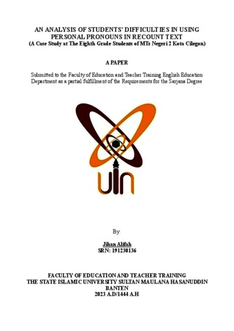 Alifah, Jihan (2023) An Analysis of Students Difficulties in Using Personal Pronouns in Recount Text (A Case Study at the Eighth Grade of MTs Negeri 2 Kota Cilegon). Diploma atau S1 thesis, UIN Sultan Maulana Hasanuddin Banten.