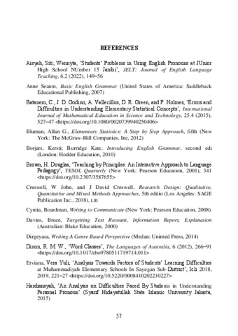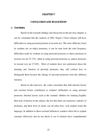 This study is aimed to measure the students‟ difficulties in using personal pronouns in recount text and to find out the causes of students‟ difficulties in using personal pronouns in recount text at the eighth grade of MTs Negeri 2 Kota Cilegon. The methodology used in this study is a case study. The data collected by test and interview. Based on the result of the test, the most difficulties faced by students are on object pronouns, it can be seen that the percentage of students‟ difficulties in using personal pronouns as object pronouns in recount text are 56.10%, while in using personal pronouns as subject pronouns in recount text are 26.82%. Based on the result of the interview, the writer concluded that the reason why students faced the difficulties in using personal pronouns in recount text are by internal factors and external factors. Internal factors such as the students‟ talent, interest and motivation in learning English are low. While the external factors, the way teachers explain the material are not clearly enough and they do not make sure that students have understood or not the material that has been explain, moreover, the environment that does not support students to learn English also very influential. In addition, limited facilities can also be the cause of students not being able to study properly.