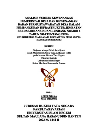 Sunjaya, Ade (2023) Analisis Yuridis Kewenangan Pemerintah Desa dan Kewenangan Badan Permusyawatan Desa dalam Pembangunan Infrastruktur Jembatan berdasarkan Undang-Undang Nomor 6 Tahun 2014 tentang Desa (Studi di Desa Margasari Kecamatan Pulo Ampel Kabupaten Serang). Diploma atau S1 thesis, UIN Sultan Maulana Hasanuddin Banten.