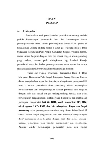 Analisis Yuridis Kewenangan Pemerintah Desa dan Kewenangan Badan Permusyawatan Desa dalam Pembangunan Infrastruktur Jembatan berdasarkan Undang-Undang Nomor 6 Tahun 2014 tentang Desa (Studi di Desa Margasari Kecamatan Pulo Ampel Kabupaten Serang)