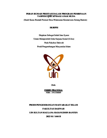 Pada tahun 2018, Lembaga Pengembangan Tilawatil Qur’an (LPTQ) Provinsi Banten melakukan survei tentang rendahnya masyarakat dalam membaca al-Qur’an di Provinsi Banten hingga menghasilkan angka sebanyak 76,72% pada tingkat sedang dan rendah. Penyebab utama dari rendahnya membaca al-Qur’an karena adanya kekurangan tenaga pengajar qur’an yang kurang terjun ke pelosok Banten. Berdasarkan permasalahan tersebut, dapat disimpulkan bahwasannya perlu adanya lembaga yang dapat menunjang peningkatan literasi al-Qur’an bagi masyarakat di Provinsi Banten. Oleh karena itu, Rumah Prestasi hadir dan menjawab permasalahan-permasalahan tentang literasi al-Qur’an dengan program utamanya ialah pembinaan tahfidz qur’an bagi anak muda di Provinsi Banten. Berdasarkan latar belakang di atas, maka rumusan masalah dalam penelitian adalah: 1) Bagaimana peran Rumah Prestasi dalam program pembinaan tahfidz qur’an bagi anak muda? 2) Bagaimana pelaksanaan program pe-mbinaan tahfidz qur’an dalam upaya literasi dan menghafal al-Qur’an bagi anak muda? 3) Bagaimana dampak kehadiran Rumah Prestasi dalam program pembinaan tahfidz qur’an? Penelitian ini bertujuan untuk menjelaskan: 1) Mendeskripsikan peran Rumah Prestasi dalam program pembinaan tahfidz qur’an bagi anak muda (studi kasus Rumah Prestasi, Kramatwatu Serang Banten) 2) Mendeskripsikan pelaksanaan program pembinaan tahfidz qur’an bagi anak muda yang dilaksanakan di Rumah Prestasi (studi kasus Rumah Prestasi, Kramatwatu Serang Banten) 3) Mendeskripsikan dampak kehadiran Rumah Prestasi dalam program pembinaan tahfidz bagi anak muda di Rumah Prestasi. Dalam penelitian ini saya menggunakan metode deskriptif kualitatif, karena saya ingin menggambarkan objek penelitian berdasarkan fakta-fakta yang terjadi di lokasi penelitian. Sedangkan untuk teknik pengumpulan datanya dengan menggunakan observasi, wawancara, dan dokumentasi. Adapun untuk waktu penelitiannya dimulai pada tanggal 20 September 2022-30 Maret 2023. Berdasarkan penelitian tersebut, dapat disimpulkan bahwa peran Rumah Prestasi dalam program pembinaan tahfidz qur’an yaitu berperan dalam meningkatkan literasi al-Qur’an bagi anak muda di Provinsi Banten. Adapun metode yang digunakan dalam tahfidz qur’an di Rumah Prestasi ialah dengan metode talaqqi dengan jenis-jenisnya yaitu, tasmi’, ‘arad, dan qiraat fi al-shalat. Selain itu, Rumah Prestasi berperan dalam pemberdayaan masyarakat bagi anak muda dengan upaya penanaman nilai moral serta upaya pemberdayaan anak muda yang berkarya melalui program-program pelatihan yaitu, 1) pelatihan public speaking, 2) pelatihan menulis buku, 3) pelatihan desain grafis, 4) pelatihan ekonomi kreatif, 5) pelatihan mahasiswa inspiratif, 6) pelatihan pembuatan website, 7) pelatihan kepemimpinan, 8) pelatihan jurnalistik, dan 9) pelatihan project sosial. Program pelatihan yang dilaksanakan di Rumah Prestasi merupakan sarana belajar yang dapat meningkatkan pengembangan diri bagi masyarakat dampingan yang mengikuti program tahfidz qur’an di Rumah Prestasi Desa Pelamunan, Kramatwatu, Serang Banten.