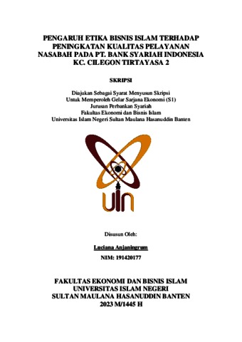 Anjaningrum, Luciana (2024) Pengaruh Etika Bisnis Islam terhadap Peningkatan Kualitas Pelayanan Nasabah pada PT. Bank Syariah Indonesia KC. Cilegon Tirtayasa 2. Diploma atau S1 thesis, UIN Sultan Maulana Hasanuddin Banten.