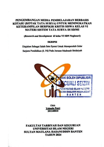 Putri, Yolanda (2024) Pengembangan Media Pembelajaran Berbasis KOTASU untuk Meningkatkan Keterampilan Berpikir Kritis Siswa Kelas VI Materi Sistem Tata Surya di SD/MI. Diploma atau S1 thesis, UIN Sultan Maulana Hasanuddin Banten.