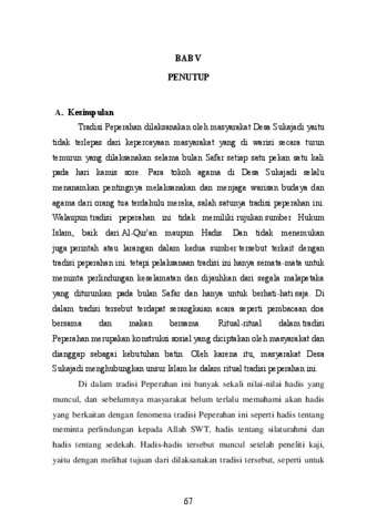 Indonesia khususnya Jawa memiliki beragam tradisi dan budaya yang lahir sejak zaman pra Islam yang sampai saat ini masih dilestarikan. Tradisi yang masih hidup saat ini tidak lepas dari adanya proses akulturasi dengan agama Islam ketika Islam masuk dan menyebar di Indonesia termasuk Jawa. Di Banten sendiri, di setiap memasuki bulan safar sebagian masyarakat percaya akan datangnya berbagai macam bala dan musibah. Kepercayaan akan diturunkannya berbagai malapetaka masih sangat kental dalam masyarakat Banten meskipun dalam praktiknya mengalami pro dan kontra di kalangan internal umat Islam. Antara lain di Desa Sukajadi Kecamatan Kragilan Kabupaten Serang, masyarakat setempat percaya akan diturunkannya berbagai malapetaka pada bulan safar. Maka dari itu, masyarakat Desa Sukajadi melaksanakan berbagai ritual pada bulan safar yang disebut dengan tradisi peperahan. Tradisi yang hidup saat ini diwarnai dengan nilai-nilai keislaman, dan menjadi hidupnya suatu teks hadis dalam tradisi ini. Maka dari itu tradisi peperahan ini menjadi topik yang akan dibahas dengan rumusan masalah yaitu: (1) Bagaimana proses rangkaian Tradisi Peperahan di Desa Sukajadi Kecamatan Kragilan Serang Banten?; (2) Bagaimana persepsi masyarakat terhadap hadis hadis yang terkait dengan Tradisi Peperahan tersebut?; (3) Apa saja hadis-hadis yang berkaitan dengan tradisi peperahan yang dilakukan oleh masyarakat Desa Sukajadi Kecamatan Kragilan Serang Banten?. Tujuan penelitian ini yaitu: (1) Untuk mengetahui bagaimana pelaksanaan Tradisi Peperahan di Desa Sukajadi Kecamatan Kragilan Serang Banten; (2) Untuk mengetahui persepsi masyarakat terkait hadis-hadis yang berkaitan dengan Tradisi Peperahan; (3) Untuk mengetahui hadis-hadis yang berkaitan dengan pelaksanaan tradisi peperahan yang dilakukan oleh masyarakat Desa Sukajadi Kecamatan Kragilan Serang Banten. Dalam skripsi ini peneliti menggunakan penelitian lapangan (field research) yakni menelusuri secara langsung informasi yang terkait dengan tradisi peperahan ke lokasi atau objek penelitian. Adapun metode yang digunakan adalah metode deskriptif kualitatif. Dalam penelitian ini menggunakan pendekatan sosiologi pengetahuan dimana dalam bidang ini dipelajari bagaimana hubungan antara pengetahuan dan masyarakat. Dan selanjutnya peneliti mengembangkan pertanyaan-pertanyaan kepada informan melalui observasi dan wawancara. Dari hasil penelitian yang dilakukan, dapat disimpulkan bahwa tradisi peperahan merupakan salah satu tradisi keagamaan yang dilakukan di Desa Sukajadi Kecataman Kragilan Kabupaten Serang. terdapat beberapa acara kegiatan yang dilakukan. pelaksanaannya yaitu pada bulan safar setiap satu pekan satu kali tepatnya pada hari kamis sore. Dalam pelaksanaan tradisi ini terdapat beberapa kegiatan yaitu, pembacaan doa bersama dan makan bersama. Adapun tujuan dari dilaksanakannya tradisi ini yaitu untuk meminta perlindungan dan agar dijauhkan dari segala malapetaka yang turun pada bulan safar. Terdapat beberapa hadis yang terkait dengan tradisi peperahan ini yaitu hadis tentang tolak bala, hadis tentang silaturahmi dan hadis tentang sedekah. Dengan adanya hadis-hadis yang terkait dengan tradisi peperahan ini sebagian besar masyarakat belum mengetahuinya, tetapi masyarakat sudah mengetahui nilai-nilai yang ada dalam pelaksanaan tradisi ini walaupun belum mengetahui secara spesifik tentang hadis-hadisnya.