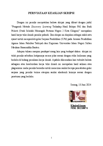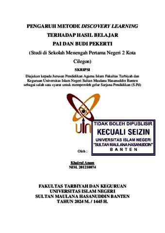 Anam, Khairul (2024) Pengaruh Metode Discovery Learning terhadap Hasil Belajar PAI dan Budi Pekerti (Studi Sekolah Menengeh Pertama Negeri 2 Kota Cilegon). Diploma atau S1 thesis, UIN Sultan Maulana Hasanuddin Banten.