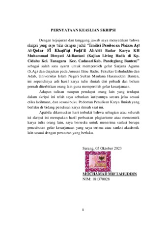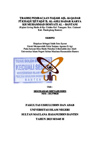 Miftahuddin, Mochamad (2024) Tradisi Pembacaan Nażam Aṣl Al-Qadar FĪ Khaṣā’iṣī Faḍā’il Al-Ahli Badar Karya KH Muhammad Dimyati Al-Bantani (Kajian Living Hadis di Kp. Cidahu Kel. Tanagara Kec. Cadasari Kab. Pandeglang Banten). Diploma atau S1 thesis, UIN Sultan Maulana Hasanuddin Banten.
