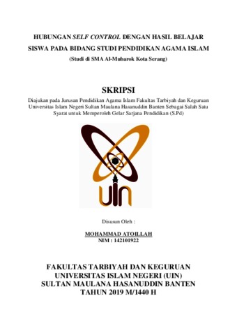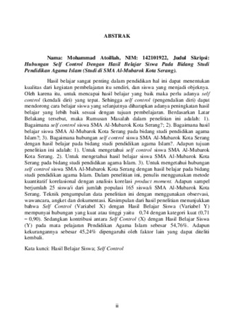 Nama: Mohammad Atoillah, NIM: 142101922, Judul Skripsi: Hubungan Self Control Dengan Hasil Belajar Siswa Pada Bidang Studi Pendidikan Agama Islam (Studi di SMA Al-Mubarok Kota Serang). Hasil belajar sangat penting dalam pendidikan hal ini dapat menentukan kualitas dari kegiatan pembelajaran itu sendiri, dan siswa yang menjadi objeknya. Oleh karena itu, untuk mencapai hasil belajar yang baik maka perlu adanya self control (kendali diri) yang tepat. Sehingga self control (pengendalian diri) dapat mendorong cara belajar siswa yang selanjutnya diharapkan adanya peningkatan hasil belajar yang lebih baik sesuai dengan tujuan pembelajaran. Berdasarkan Latar Belakang tersebut, maka Rumusan Masalah dalam penelitian ini adalah: 1). Bagaimana self control siswa SMA Al-Mubarok Kota Serang?; 2). Bagaimana hasil belajar siswa SMA Al-Mubarok Kota Serang pada bidang studi pendidikan agama Islam?; 3). Bagaimana hubungan self control siswa SMA Al-Mubarok Kota Serang dengan hasil belajar pada bidang studi pendidikan agama Islam?. Adapun tujuan penelitian ini adalah: 1). Untuk mengetahui self control siswa SMA Al-Mubarok Kota Serang. 2). Untuk mengetahui hasil belajar siswa SMA Al-Mubarok Kota Serang pada bidang studi pendidikan agama Islam. 3). Untuk mengetahui hubungan self control siswa SMA Al-Mubarok Kota Serang dengan hasil belajar pada bidang studi pendidikan agama Islam. Dalam penelitian ini, penulis menggunakan metode kuantitatif korelasional dengan analisis korelasi product moment. Adapun sampel berjumlah 25 siswa/i dari jumlah populasi 165 siswa/i SMA Al-Mubarok Kota Serang. Teknik pengumpulan data penelitian ini dengan menggunakan observasi, wawancara, angket dan dokumentasi. Kesimpulan dari hasil penelitian menunjukkan bahwa Self Control (Variabel X) dengan Hasil Belajar Siswa (Variabel Y) mempunyai hubungan yang kuat atau tinggi yaitu 0,74 dengan kategori kuat (0,71 – 0,90). Sedangkan kontribusi antara Self Control (X) dengan Hasil Belajar Siswa (Y) pada mata pelajaran Pendidikan Agama Islam sebesar 54,76%. Adapun kekurangannya sebesar 45,24% dipengaruhi oleh faktor lain yang dapat diteliti kembali. Kata kunci: Hasil Belajar Siswa; Self Control