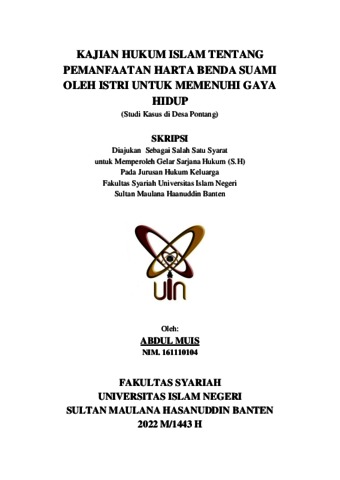 Muis, Abdul (2022) Kajian Hukum Islam Tentang Pemanfaatan Harta Suami Oleh Istri Untuk Memenuhi Gaya Hidup (Studi Kasus Desa Pontang). Diploma atau S1 thesis, UIN Sultan Maulana Hasanuddin Banten.