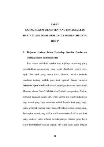 Dalam hidup berumah tangga nafkah merupakan bentuk tanggung jawab suami terhadap istri dan anaknya, jumlah nafkah disesuaikan dengan pendapatan suami. Namun dengan seiring perkembangan zaman dapat memicu pola hidup yang didasari hobi atau keinginan tersendiri, maka bertambah nafkah yang harus suami berikan. Disisi itu istri sepatutnya lebih bias mengatur pengeluaran yang lebih mengutamakan kebutuhan primer dibanding keinginan diri sendiri, terlebih jika harta yang digunakan adalah harta bawaan suami sebelum adanya pernikahan istri tidak bisa begitu saja mempergunakannya tanpa izin sumi atau kesepakatan bersama. Perumusan masalah dari skripsi ini adalah: 1). Bagaimana tinjauan hukum Islam terhadap standar pemberian nafkah suami terhadap istri? 2). Bagaimana hukum penggunaan harta suami oleh istri untuk memenuhi gaya hidup menurut hukum islam? Tujuan penelitian ini adalah: 1). Untuk mengetahui standar pemberian nafkah suami terhadap istri menurut syariat Islam. 2). Untuk mengetahui bagaimana hukum penggunaan harta suami oleh istri untuk memenuhi gaya hidup menurut Islam. Penelitian ini merupakan penelitian kepustakaan (Library research) dengan bersifat deskriptif. Teknik pengumpulan data yang digunakan adalah observasi, wawancara dan dokumentasi yang bersifat data a. Primer dan b. Sukender. Berdasarkan hasil penelitian: 1). Bahwa standar nafkah suami terhadap istri menurut ulama Hanafi, Maliki, Syafi‟i dan Hambali mengatakan diukur menurut keadaan suami dan tidak menentukan jumlah nafkah atau kadar nafkah. 2). Hukum penggunaan harta benda suami oleh istri itu boleh saja selama untuk pemenuhan kebutuhan rumah tangga akan tetapi disesuaikan dengan kemampuan suami, karena ajaran Islam mengajarkan untuk mengelola keuangan dan mempergunakannya dalam hal-hal yang baik yang tidak menimbulkan kemurkaan Allah.
