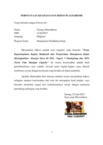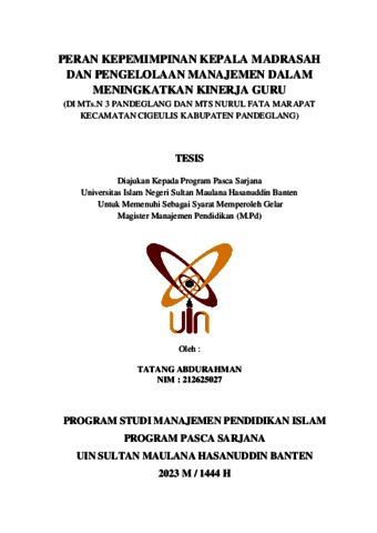 Abdurahman, Tatang (2023) Peran Kepemimpinan Kepala Madrasah dan Pengelolaan Manajemen dalam Meningkatkan Kinerja Guru (Di MTs. Negeri 3 Pandeglang dan MTS Nurul Fata Marapat Cigeulis Kabupaten Pandeglang). Magister thesis, UIN Sultan Maulana Hasanuddin Banten.