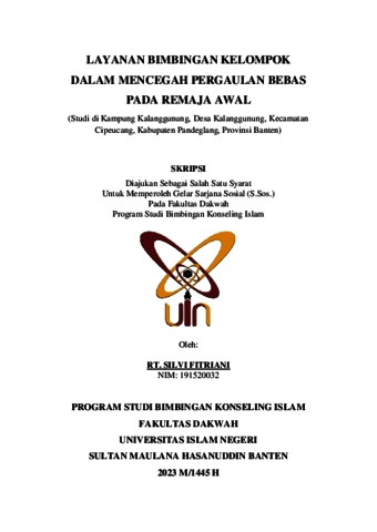 Fitriani, Rt. Silvi (2024) Layanan Bimbingan Kelompok Dalam Mencegah Pergaulan Bebas Pada Remaja Awal (Studi di Kampung Kalanggunung, Desa Kalanggunung, Kecamatan Cipeucang, Kabupaten Pandeglang, Provinsi Banten). Diploma atau S1 thesis, UIN Sultan Maulana Hasanuddin Banten.