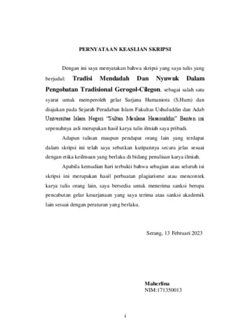 Maherlina, Maherlina (2024) Tradisi Mendadah dan Nyuwuk dalam Pengobatan Tradisional Gerogol Cilegon. Diploma atau S1 thesis, UIN Sultan Maulana Hasanudin Banten.