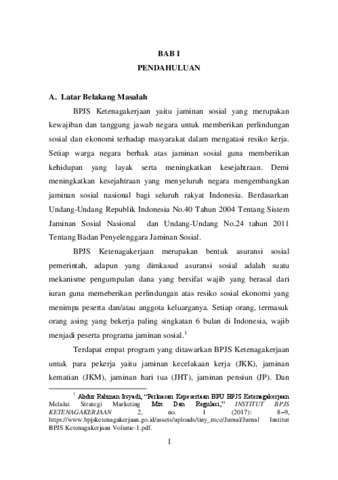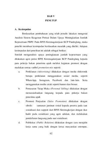BPJS Ketenagakerjaan yaitu jaminan sosial yang merupakan kewajiban dan tanggung jawab negara untuk memberikan perlindungan sosial dan ekonomi terhadap masyarakat dalam mengatasi resiko kerja. Setiap warga negara berhak atas jaminan sosial guna memberikan kehidupan yang layak serta meningkatkan kesejahtraan. Kesulitan pecapain target kepesertaan bukan penerima upah menjadi perhatian khusus bagi jajaran manajemen BPJS Ketenagakerjaan untuk itu dibentuknya sistem keagenan perisai untuk mengedukasi, mengakuisis, serta memberikan informasi terkatit program dan manfaat BPJS Ketenagakerjaan. Karena dilihat dari pekerja bukan penerima upah ini merupakan pekerja mandiri seperti nelayan, pedagang, petani, tukang ojek, dan lain sebagainya. Oleh karena itu, perlindungan jaminan sosial terhadap tenaga kerja bukan penerima upah sangat penting dikarnakan sifat dan jenis kepesertaannya sendiri sangat rentan terhadap resiko dan ancaman sosial ekonomi seperti kemiskinan dan pengangguran. Penelitian ini dilakukan di BPJS Ketenagakerjan KCP Pandeglang untuk mengetahui upaya promotion mix jasa yang dilakukan agen perisai dalam meningkatkan jumlah kepesertaan di BPJS Ketenagkerjaan KCP Pandeglang. Rerumusan masalah dalam penelitian ini yaitu Bagaimana upaya Agen Perisai dalam meningkatkan jumlah kepesertaaan pada pekerja bukan penerma upah?. Adapun tujuan dari penelitian ini yaitu Untuk menganalisis upaya Agen Perisai dalam meningkatkan jumlah kepesertaan pada pekerja bukan penerima upah. Penelitian ini menggunakan pendekatan kualitatif dengan yang dikembangkan menggunakan metode deskriptif. Teknik pengumpulan data yang digunakan dalam penelitian ini yaitu menggunakan data primer dan data skunder. Data primer didapat dari hasil wawancara dan observasi. Data skunder didapat dari buku-buku, jurnal, penelitian terdahulu yang relevan dan sumber lainnya. Penerapan promotion mix jasa dalam upaya meningkatkan jumlah kepesertaan yang dilakukan agen perisai BPJS Ketenagakerjaan KCP Pandeglang dengan melakukan periklanan (adversting), pemasran tatap muka (personal selling), promosi penjualan (sales promotion), publisitas (public relation), pemasaran langsung (direct marketing), telah dilakukan dengan baik oleh agen perisai BPJS Ketenagakerjaan KCP Pandeglang. Sehingga upaya peningkatan jumlah kepesertaan pekerja bukan penerima upah telah maksimal.