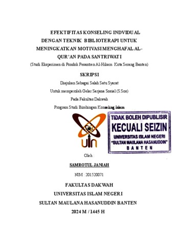 | Kata Kunci (keywords): | Menghafal Al-Qur’an, Santriwati, Teknik Biblioterapi. |