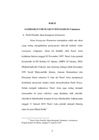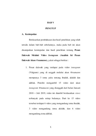 Saat ini telah berkembang beragam situs media sosial di internet, seperti instagram, facebook, twitter, myspace, youtube, whatsapp, google plus dan lain sebagainya. Sebagai ruang sosial baru, internet memiliki peluang yang sama dalam memfasilitasi gerakan-gerakan sosial, termasuk gerakan sosial keagamaan seperti berdakwah. Saat ini menyebarkan dan mendengarkan dakwah melalui media sosial sangat diminati oleh kebanyakan masyarakat. Salah satu media sosial yang mengirimkan video dakwah ialah akun instagram @nunuzoo. Berdasarkan latar belakang di atas, maka rumusan masalah dalam penelitian ini adalah: 1).Apa saja tema dakwah yang terdapat pada akun @nunuzoo? 2).Bagaimana gaya penyampaian yang digunakan oleh akun @nunuzoo? 3). Bagaimana respon followers terhadap pesan dakwah yang disampaikan oleh akun @nunuzoo? Penelitian ini bertujuan untuk: 1).Mengetahui dan menjelaskan tema dakwah yang terdapat pada akun @nunuzoo 2).Mengetahui dan menjelaskan gaya penyampaian yang digunakan akun @nunuzoo. 3). Untuk mengetahui dan menjelaskan respon followers terhadap pesan dakwah yang disampaikan oleh akun @nunuzoo. Dalam penelitian ini, digunakan jenis penelitian kualitatif deskriptif, dengan teknik analisis isi. Yaitu menganalisis dan menyajikan fakta secara sistematik, sehingga lebih mudah dipahami dan disimpulkan. Sedangkan teknik pengumpulan data penelitian ini menggunakan dokumentasi, observasi dan wawancara. Berdasarkan penelitian yang dilakukan, dapat disimpulkan bahwa: Pesan dakwah yang terdapat pada video instagram (Vidgram) yang di unggah melalui akun @nunuzoo mempunya 3 tema yaitu tentang ibadah sebanyak 6 video, akidah 3 video dan akhlak 3 video. Peneliti mengambil 15 video dari akun instagram @nunuzoo yang diunggah dari bulan Januari 2018 – Juli 2019, video ini diambil berdasarkan views terbanyak pada setiap bulannya. Gaya penyampaian pesan dakwah yang digunakan pada akun @nunuzoo berupa dialog, adegan, dan juga nyanyian. Selain itu, beberapa video yang diunggah selalu diselipkan humor atau lawakan, karena memang awalnya akun ini adalah akun bergenre komedi. Tujuan dari menyelipkan humor pada setiap video yang di unggah agar orang yang melihatnya tidak merasa jenuh dan juga bosan, sehingga pesan yang disampaikan bisa diterima dengan baik. Pengikut atau follower dari akun instagram @nunuzoo mempunyai respon positif dan respon negatif dalam menanggapi video yang diunggah. Namun kebanyakan dari respon yang ada berupa respon yang positif. Kata Kunci: Dakwah, Instagra