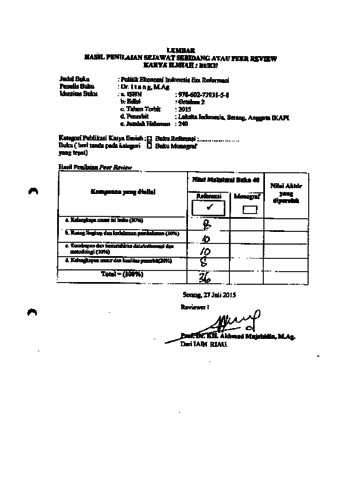 Itang, (2016) Hasil Penilaian Sejawat Sebidang atau Peer Review Karya Ilmiah : Buku Politik Ekonomi Indonesia Era Reformasi. Laksita Indonesia, Serang, Anggota IKAPI, Serang-Banten.